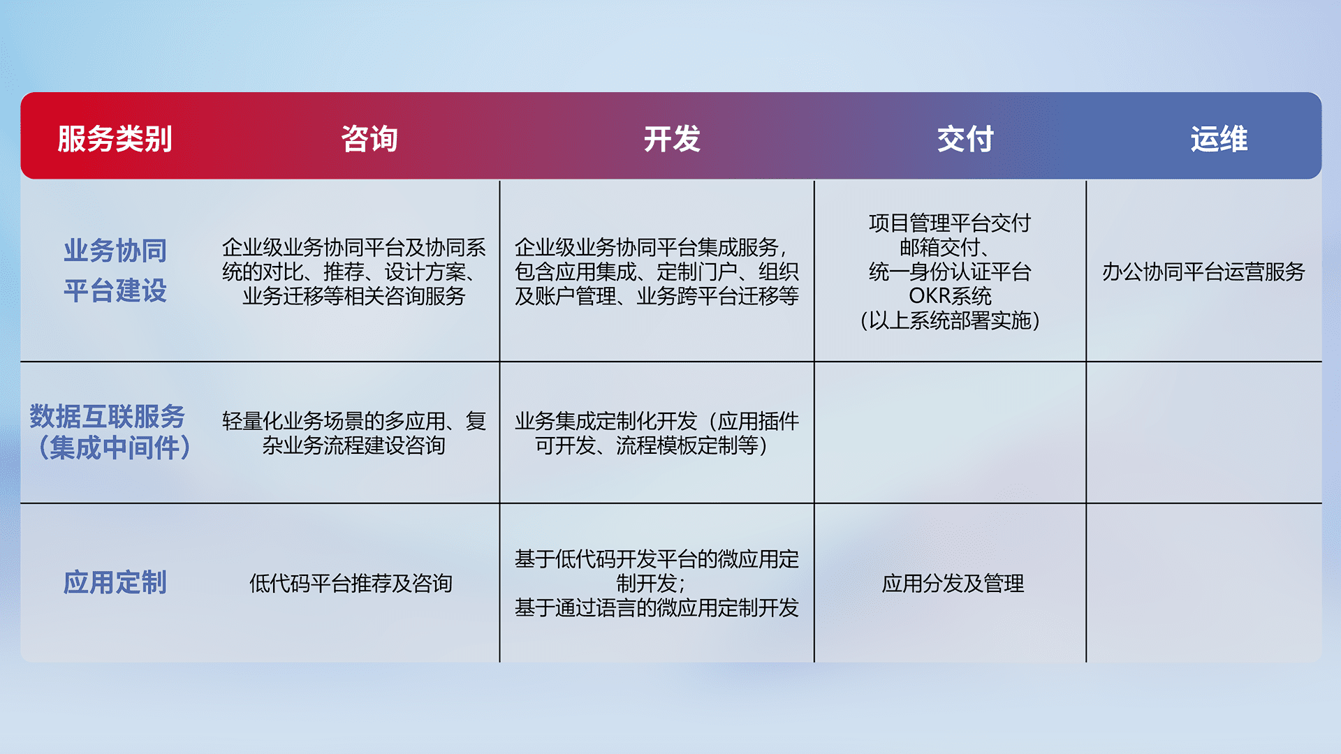 针对钉钉、、、、企微、、、、IDaas等平台级产品提供产品的规划、、、方案、、、、交付、、定制化开发等服务,,,实现如统一协同办公、、、智能客户服务、、、混合会议管理、、、、智能数据查询、、等业务场景,,实现数字化转型。。。。